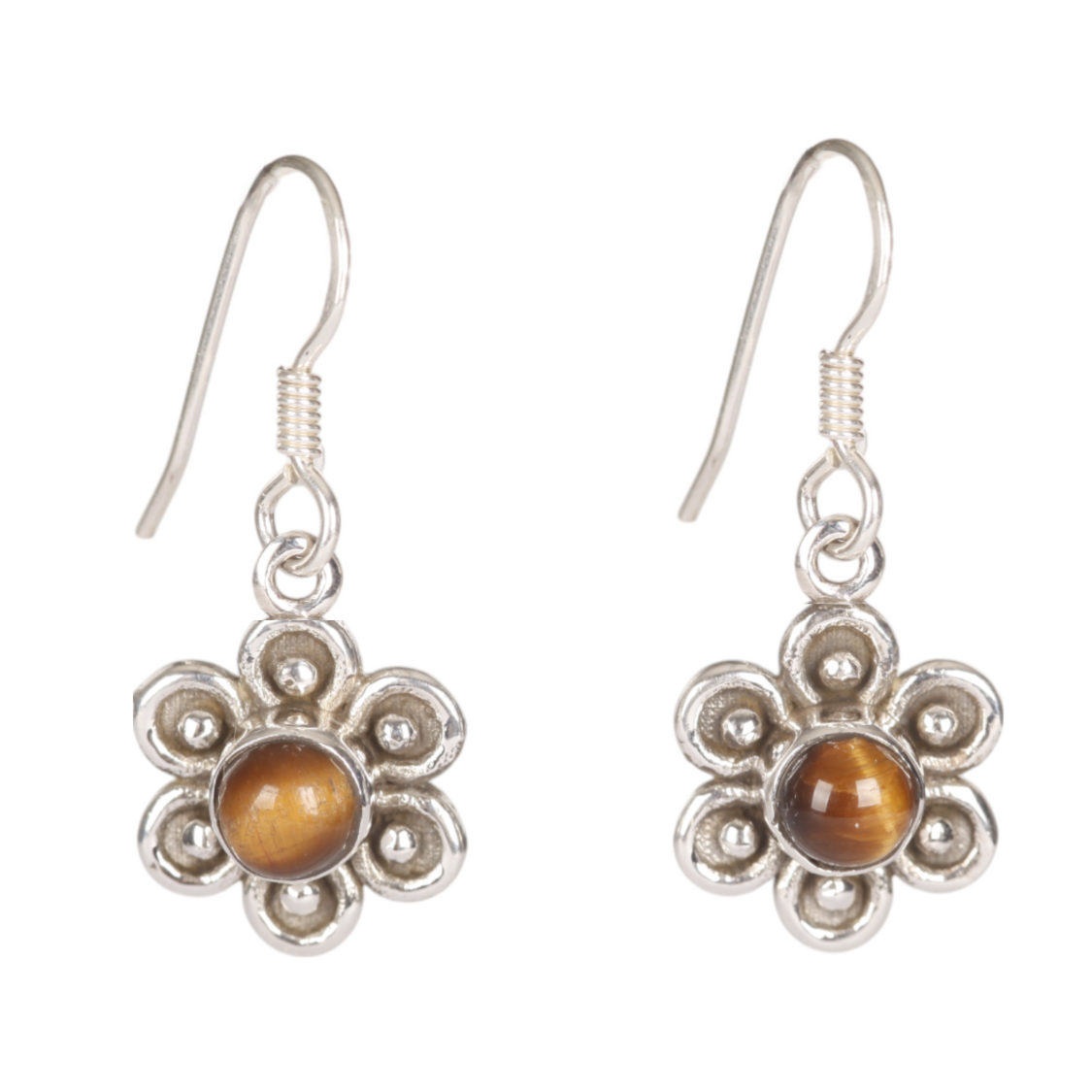 Earrings flower Tiger’s Eye 5,5mm round cabochon silver 925