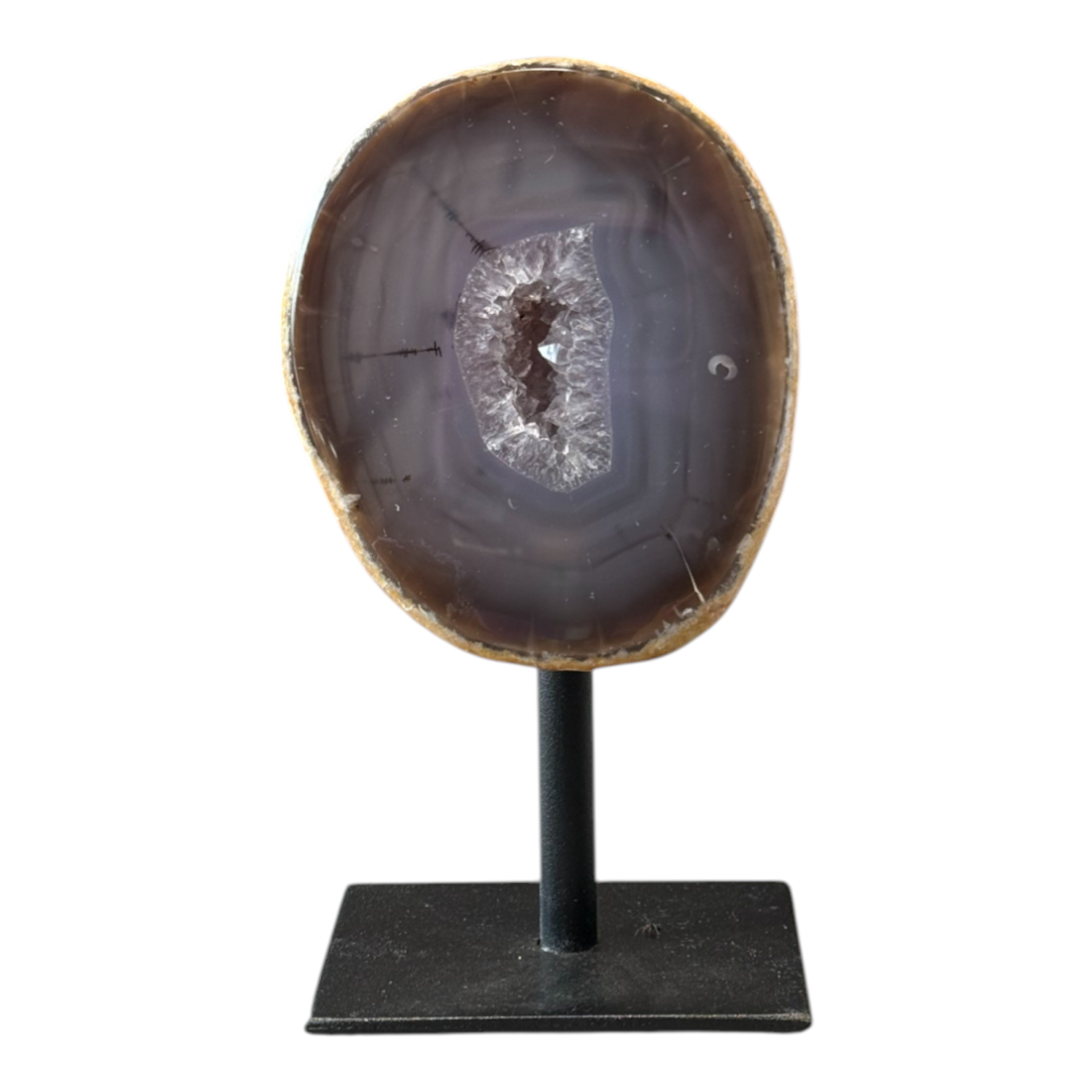 Agate halve on metal stand, Brazil.