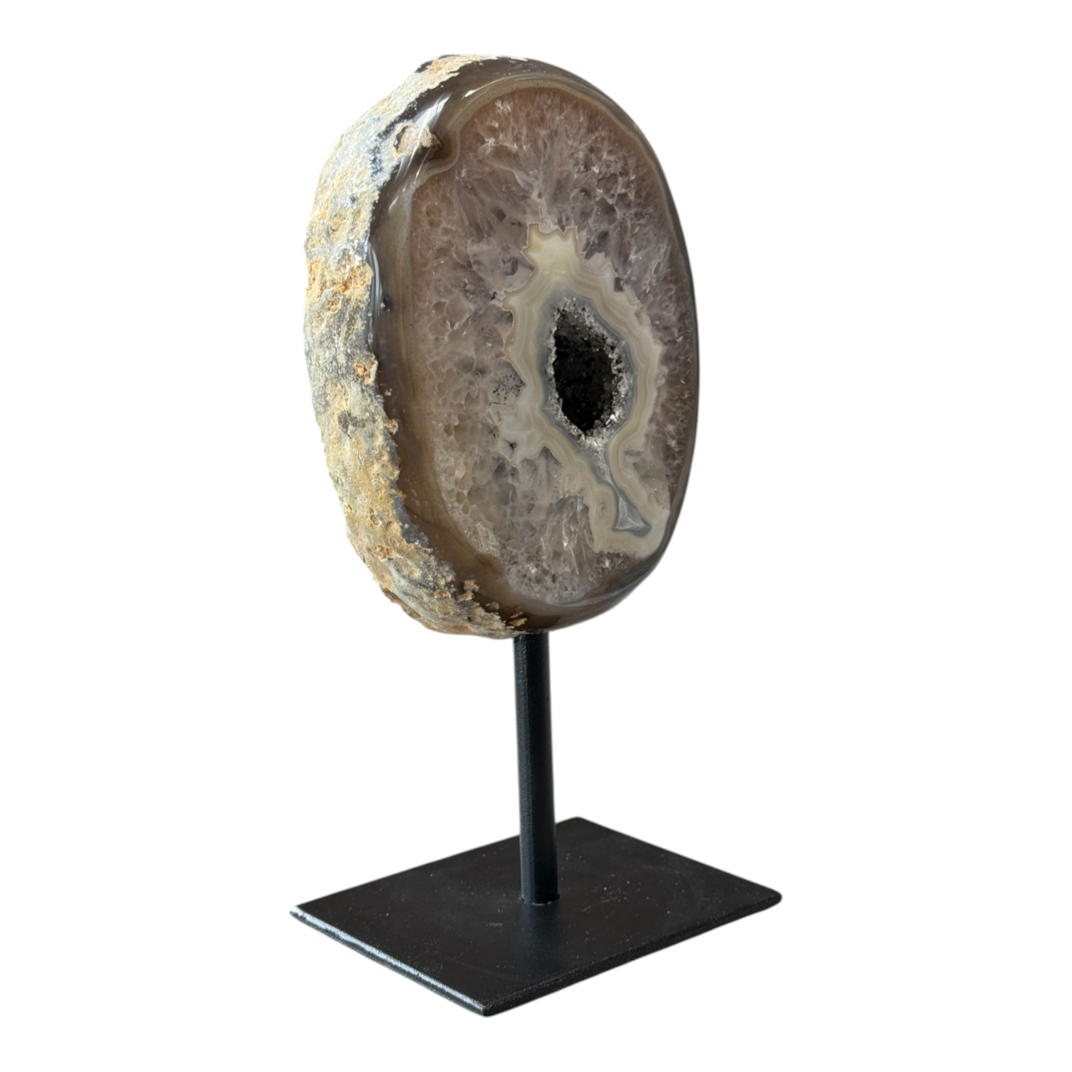 Agate halve on metal stand, Brazil.