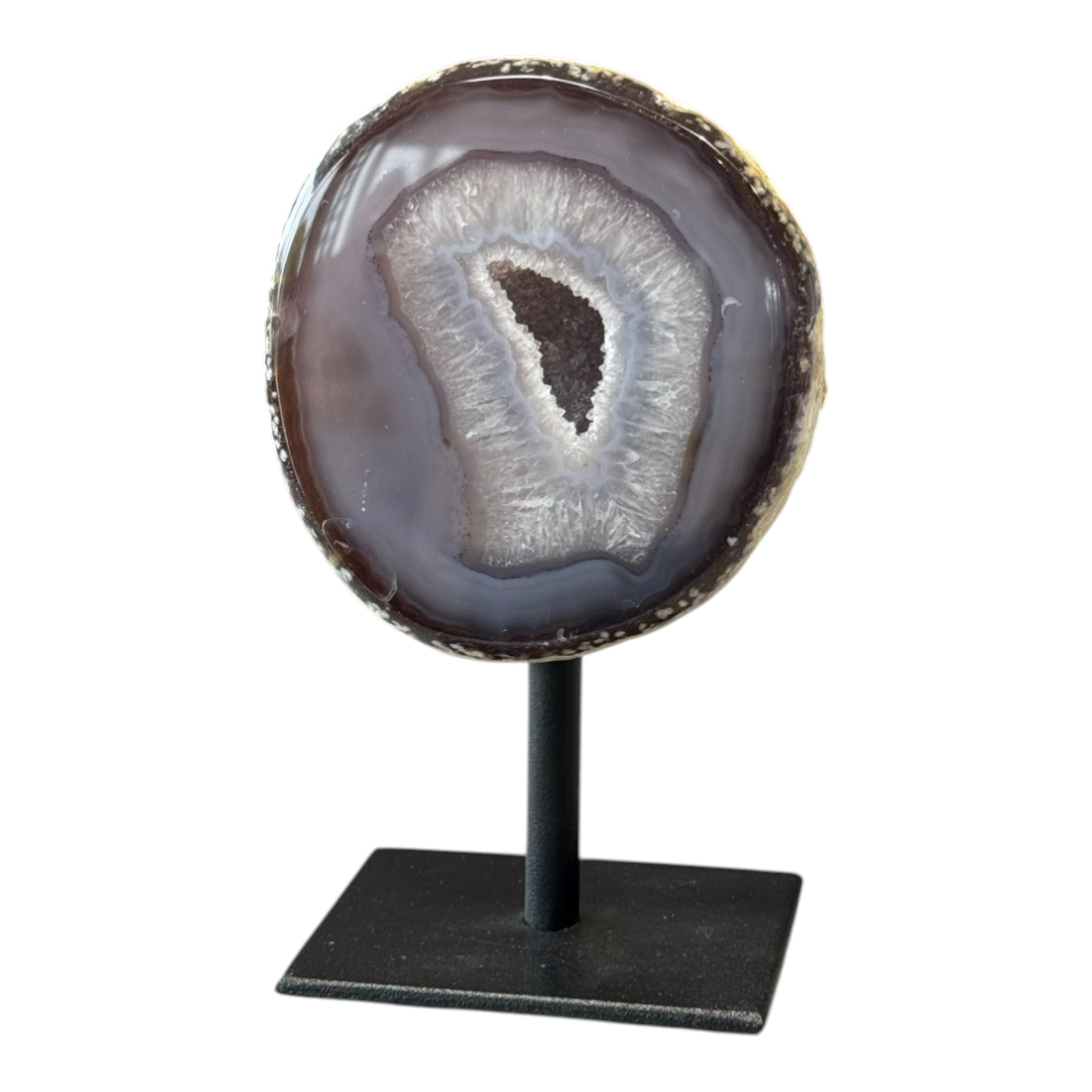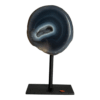 Agate halve on metal stand, Brazil.