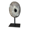 Agate is a popular mineral that is often found in volcanic cavities. The often layered stone is a crypto-crystalline form of quartz, which means that the crystals form on a microscopic scale and are not detectable by the naked eye. The wide range of colours in which agate is found is caused by metal ions dispersed throughout the mineral. Agate forms when in water dissolved silica (quartz) flows past a cavity in the rock while the liquid, also called silicic acid, is cooling down. Because of the cooling, the water can contain less quartz and it deposits these quartz-molecules. Depending on the circumstances, the quartz can form in macro- or microcrystalline (also called cryptocrystalline) shape. In the last case, Agate can come into existence. The name Agate is derived from an ancient name for the river Dirillo, namely Achates, in Sicily, where Agate was first discovered.