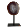 Agate is a popular mineral that is often found in volcanic cavities. The often layered stone is a crypto-crystalline form of quartz, which means that the crystals form on a microscopic scale and are not detectable by the naked eye. The wide range of colours in which agate is found is caused by metal ions dispersed throughout the mineral. Agate forms when in water dissolved silica (quartz) flows past a cavity in the rock while the liquid, also called silicic acid, is cooling down. Because of the cooling, the water can contain less quartz and it deposits these quartz-molecules. Depending on the circumstances, the quartz can form in macro- or microcrystalline (also called cryptocrystalline) shape. In the last case, Agate can come into existence. The name Agate is derived from an ancient name for the river Dirillo, namely Achates, in Sicily, where Agate was first discovered.