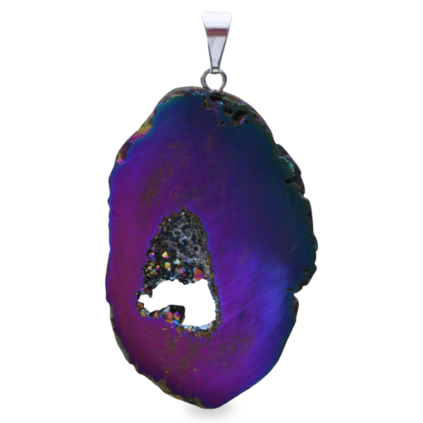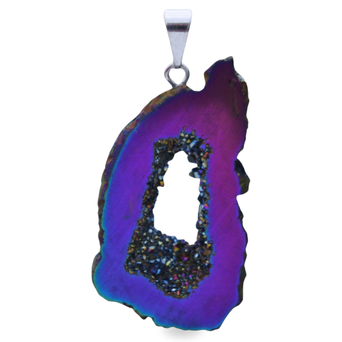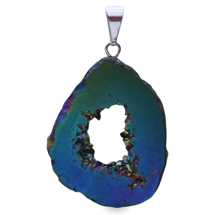 Log in for pricesPendant geode slice, rainbow coated, silver plated bail, Brazil.