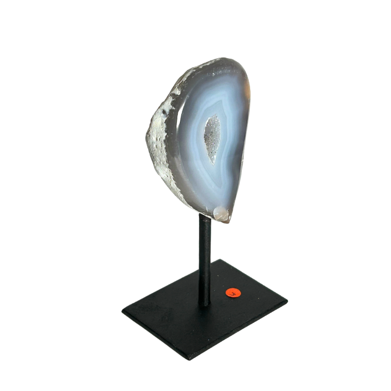 Agate halve on metal stand, Brazil.