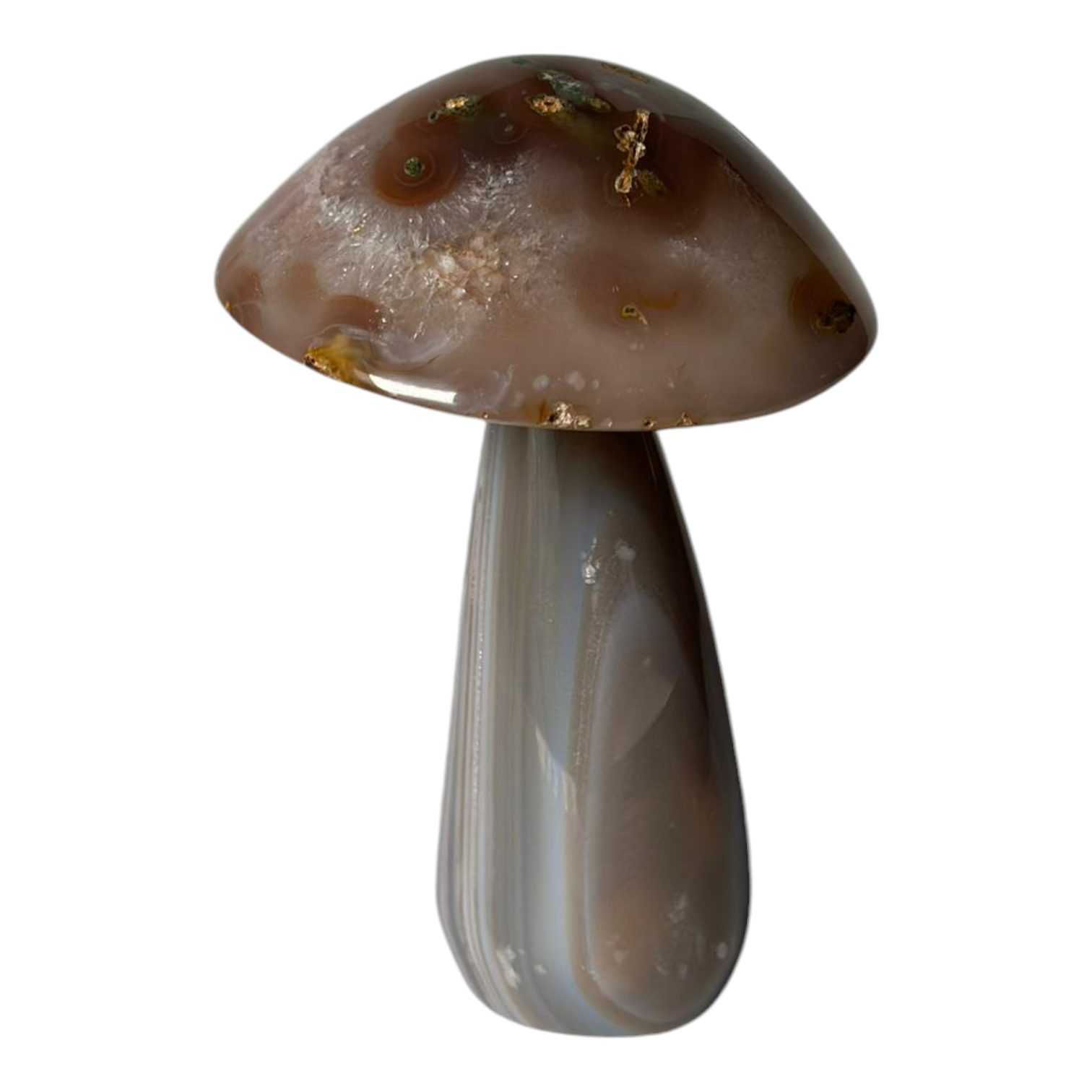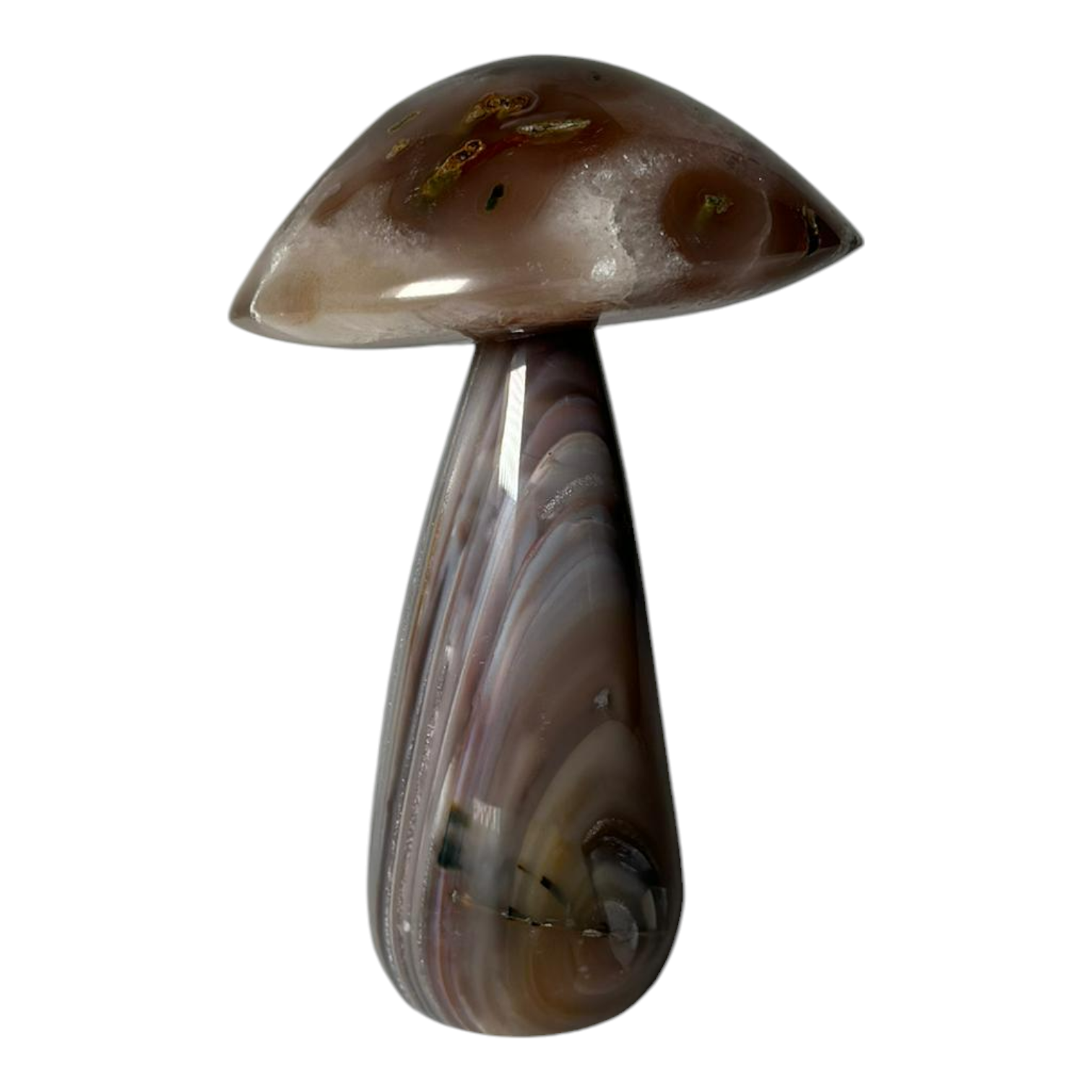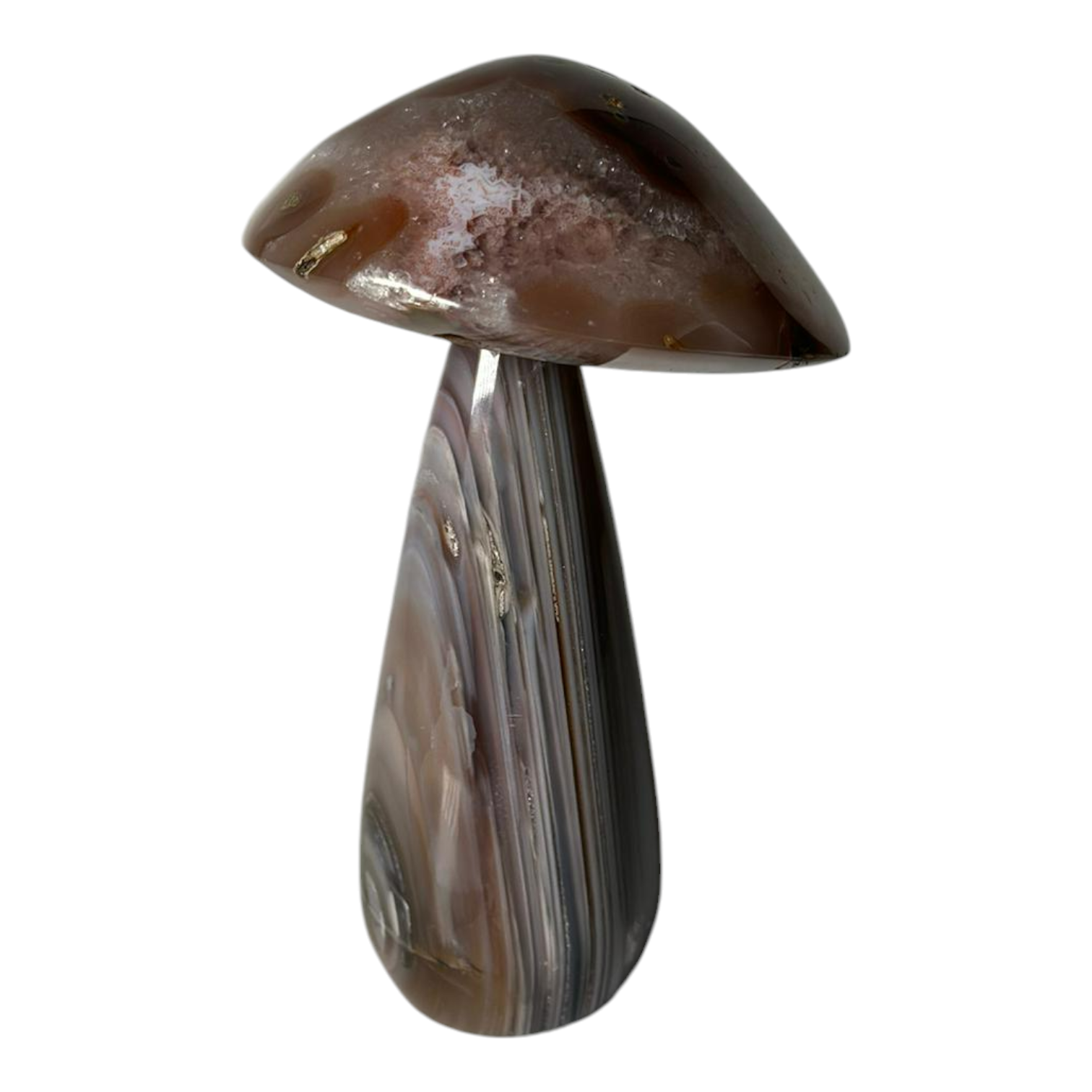 Agate is a popular mineral that is often found in volcanic cavities. The often layered stone is a crypto-crystalline form of quartz, which means that the crystals form on a microscopic scale and are not detectable by the naked eye. The wide range of colours in which agate is found is caused by metal ions dispersed throughout the mineral. Agate forms when in water dissolved silica (quartz) flows past a cavity in the rock while the liquid, also called silicic acid, is cooling down. Because of the cooling, the water can contain less quartz and it deposits these quartz-molecules. Depending on the circumstances, the quartz can form in macro- or microcrystalline (also called cryptocrystalline) shape. In the last case, Agate can come into existence. The name Agate is derived from an ancient name for the river Dirillo, namely Achates, in Sicily, where Agate was first discovered.