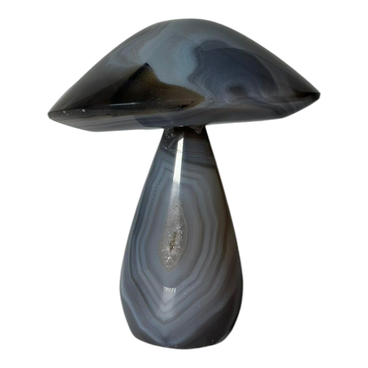 Agate is a popular mineral that is often found in volcanic cavities. The often layered stone is a crypto-crystalline form of quartz, which means that the crystals form on a microscopic scale and are not detectable by the naked eye. The wide range of colours in which agate is found is caused by metal ions dispersed throughout the mineral. Agate forms when in water dissolved silica (quartz) flows past a cavity in the rock while the liquid, also called silicic acid, is cooling down. Because of the cooling, the water can contain less quartz and it deposits these quartz-molecules. Depending on the circumstances, the quartz can form in macro- or microcrystalline (also called cryptocrystalline) shape. In the last case, Agate can come into existence. The name Agate is derived from an ancient name for the river Dirillo, namely Achates, in Sicily, where Agate was first discovered.